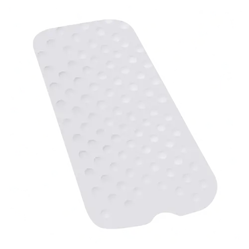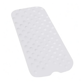 Extra-long bath mat adds safety and security by providing a large, slip-proof surface. This mat is held securely by multiple suction cups. Made of a soft latex free rubber that is easy-to-clean and roll up for storage. This mat has a contour-cut design to fit around drain and is treated to resist mold.